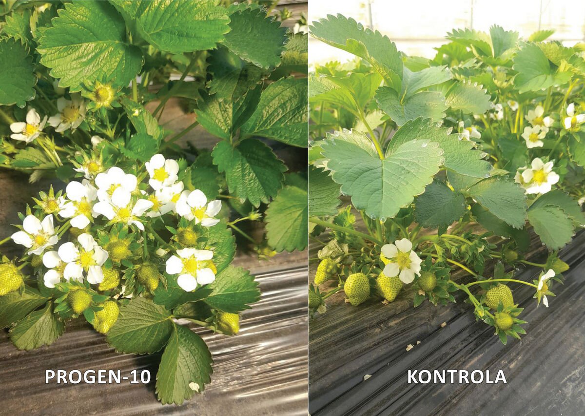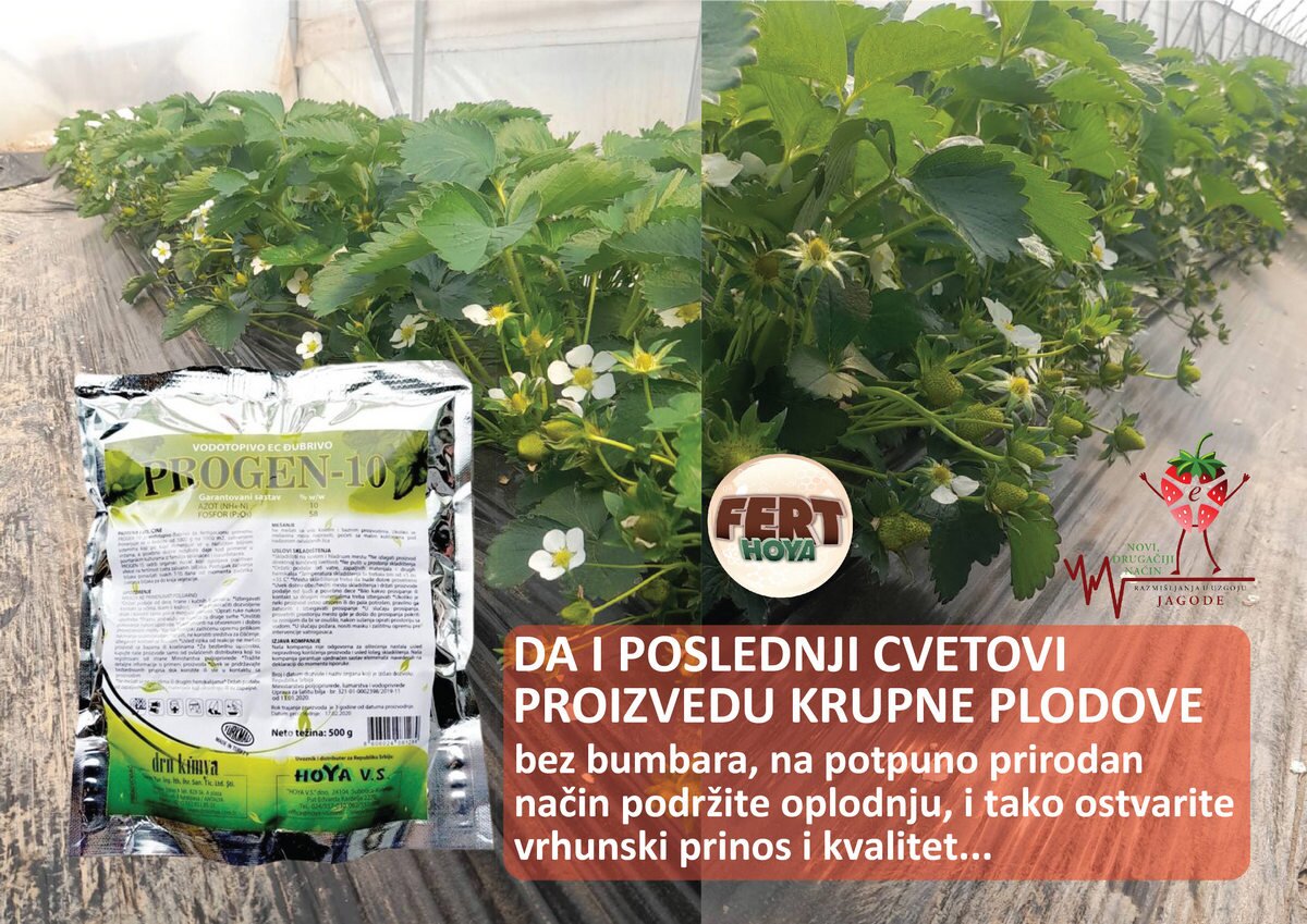 U većini zaštićenih objekata jagoda je zametnula prvu i drugu seriju plodova, ali još uvek ima značajan broj cvetova koji se otvaraju (tzv. treća serija ili kolo). U tom slučaju, da bi se i poslednji cvetovi razvili u kvalitetne plodove potrebno je stimulisati njihov razvoj i oplodnju. Dakle, druga aplikacija PROGEN-10 je na redu.
