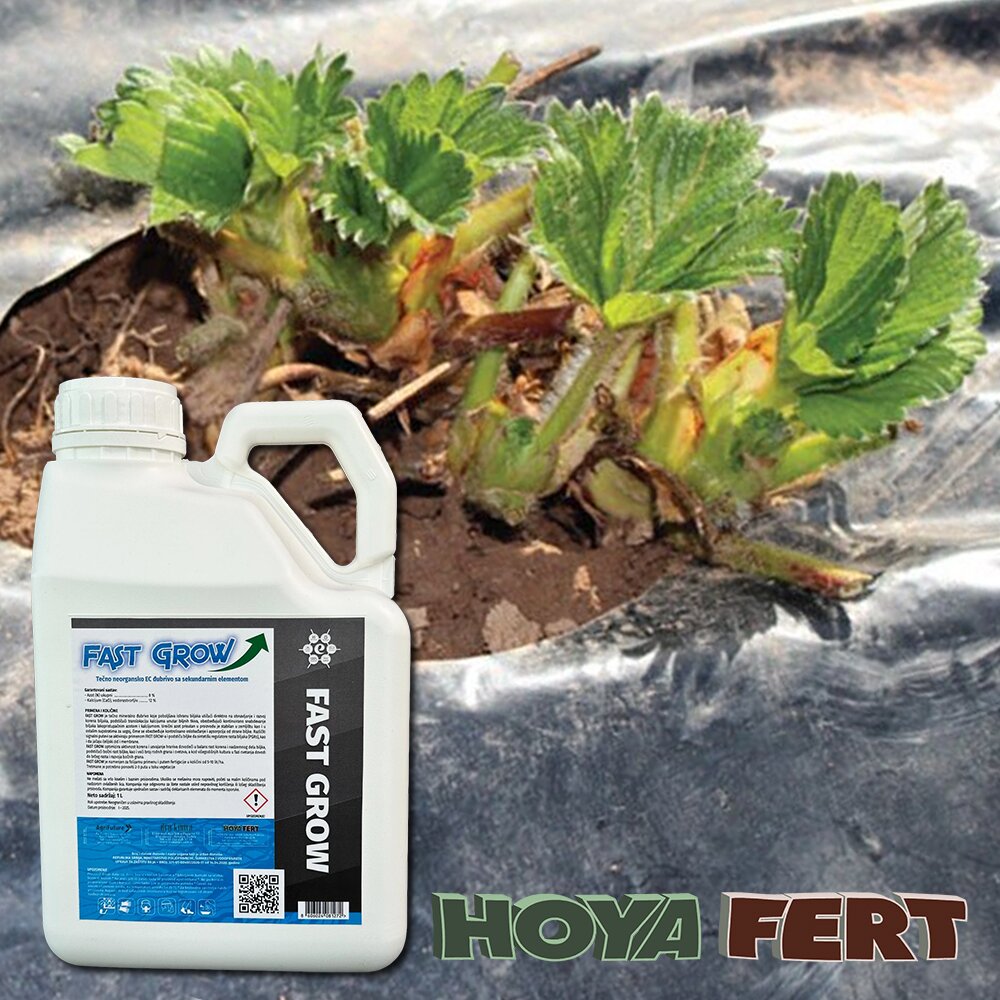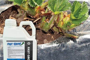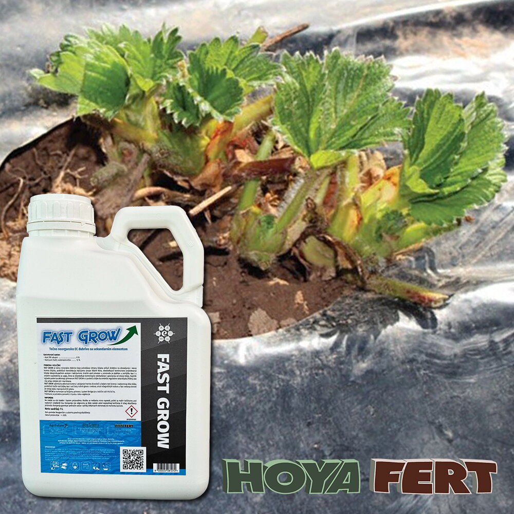 FAST-GROW je ekskluzivna i inovativna kombinacija azotnog (N) đubriva sa kalcijumom (Ca), namenjeno za održavanje kontinuiranog rasta korena, i stimulisanje organizovanog rasta nadzemnog dela - bokornica biljaka jagode, tako što povećava, i u kontinuitetu podržava, odnosno promoviše prirodnu sintezu citokinina, hormona rasta, štedi energiju biljke kod njenog iskorišćenja azota, i predstavlja jedan od najboljih izvora azota za biljke, tako da možete prestati sa korišćenjem uobičajenih ili klasičnih đubriva u proizvodnji jagode.