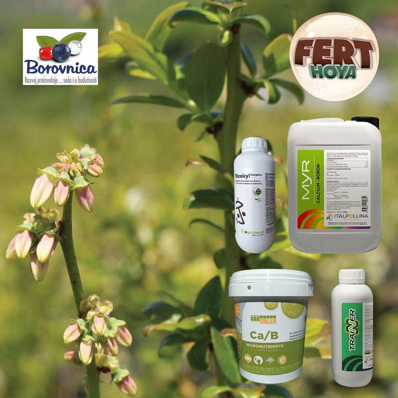 Zbog promenljivih vremenskih uslova koji će se po prognozi nastaviti u narednom periodu, stvoreni su povoljni uslovi za pojavu bolesti u zasadima borovnice. Nastaviti sa primenom RIZOKYL SIMPLEX-a 0,3%, kako bi podigli otpornost biljke i zaštitili je od gljivičnih i bakterijskih oboljenja. Uz RIZOKYL SIMPLEX naša preporuka je dodati i MYR Ca B u koncentraciji 0,35% ili Gel Ca B 0,5% jer se Ca zbog hladnog vremena teže usvaja, a Bor je neophodan kako bi se cvetanje i oprašivanje obavljalo nesmetano. TRAINER dodati obavezno u količini od 300ml/100 l vode kako bi se smanjio stres izazvan klimatskim faktorima.
