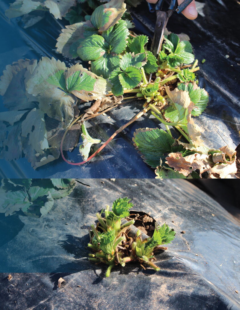 Krajem zime, redovno obilazite plantaže jagode, i kada na većini biljaka uočite pojavu zelenih vrhova na bokornicama nastupila je ova fenofaza... ovo je momenat kad treba započeti čišćenje biljaka jagode... kada se pojave zeleni pupoljci na bokornicama uklanja se staro lišće, kao i cvetne grane ukoliko ih ima, te stoloni... čišćenje biljaka jagode nemojte raditi prerano, i napravite dobru procenu za koju je važno Vaše iskustvo, kako je ova aktivnost specifi čna za svaku lokaciju na kojoj se uzgaja jagoda... orentaciono, većina proizvođača jagode u regiji čišćenje obavlja u prvoj polovini meseca februara ukoliko se radi o uzgoju u visokim tunelima, a na otvorenom polju nešto kasnije... ukoliko prerano uradite čišćenje biljaka jagode postoji mogućnost da rodni pupoljci budu oštećeni do niskih temperatura koje nakon toga uslede... mnogi proizvođači se oslanjaju na prekrivanje biljaka jagode agrilom, ne vodeći računa da u uslovima izrazito niske temperature ispod istog može doći do stvaranja mikroklimata zbog čega štete budu još veće... za sprečavanje šteta od niskih temperatura pogledajte PLAN c specijalne ishrane biljaka jagode... ovo još nije momenat za prvu primenu đubriva, obzirom da se zemljište još nije dovoljno zagrijalo da bi koren bio aktivan... početni rast i razvoj biljaka jagode u ovom momentu zavisi od hrane uskladištene prethodne sezone, zbog čega je godina sadnje od izuzetnog značaja za planiranje ishrane... pre planiranja ishrane biljaka jagode, napravite dobru procenu o rezervama hrane iz sezone sadnje… NIKADA NEMOJTE PRIMENJIVATI ĐUBRIVA BEZ PRETHODNE PROCENE… nakon čišćenja starog, promrzlog i odumrlog lišća sa biljaka jagode, proizvođači uobičajeno praktikuju odgovarajuću zaštitu kombinacijom preparata na bazi bakra i sumpora, a za jedinstvena rešenja koja preporučuje naš tim stručnjaka pogledajte PLAN D... ukoliko se uzgoj organizuje u zaštićenom prostoru, u kojem je zbog toplog vremena uočeno prisustvo lisne uši, ili ostalih insekata štetočina, planirati i odgovarajući tretman za njihovu kontrolu... ISPRAVAN POČETAK SEZONE PRVI JE PREDUSLOV DA ISTI TAKAV BUDE I KRAJ...